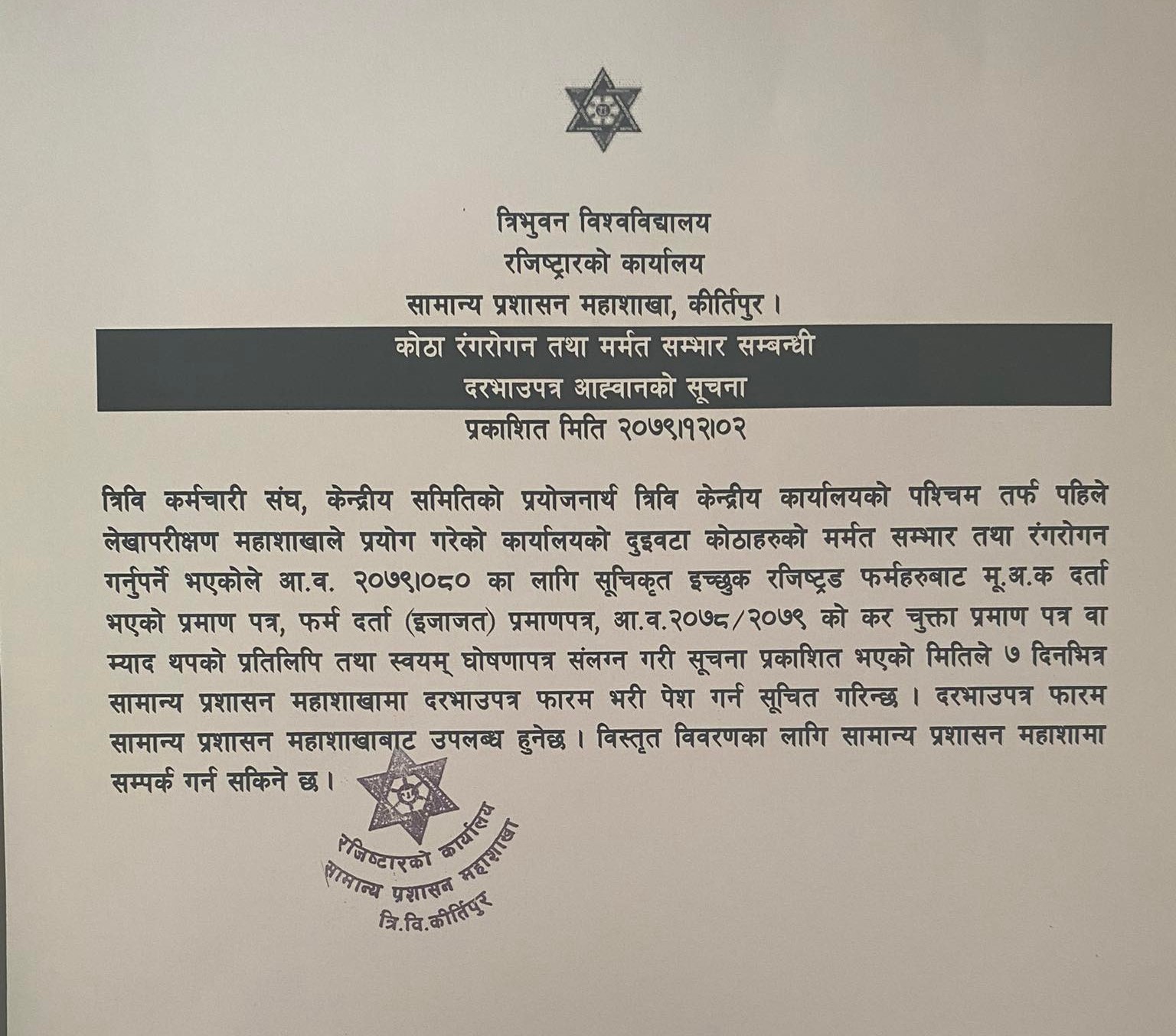 कोठमा रंगरोगन तथा मर्मत सम्भार सम्बन्धी दरभाउपत्र आव्हानको सूचना ।