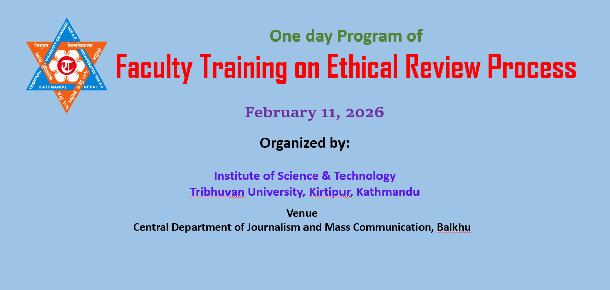 विज्ञान तथा प्रविधि अध्ययन संस्थानले अनुसन्धानमा अपनाउनुपर्ने आचरण सम्बन्धमा एक दिने तालिम कार्यक्रम सम्पन्न गरेको छ । अनुसन्धान आचरण समीक्षा बोर्डका अध्यक्ष प्रा.डा. चित्रबहादुर बुढाथाेकीकाे प्रमुख आतित्थ्यमा उद्घाटित उक्त कार्यक्रमको सभापतित्व अध्ययन संस्थानका डीन प्रा.डा. शंकर प्रसाद खनालले गर्नुभएको थियो । उक्त कार्यक्रममा अध्यक्ष बुढाथाेकीले आफ्नो मन्तव्यमा त्रिविमा अनुसन्धान आचरण समीक्षाको महत्व दर्शाउँदै अनुसन्धान आचरण समीक्षा बोर्डको कार्यविधि निर्माण र बोर्ड गठनका सम्बन्धमा विगतमा भएका प्रयासहरुको जानकारी दिनुभएको थियो । उक्त कार्यक्रममा नेपाल स्वास्थ्य अनुसन्धान परिषद्का सदस्यसचिव प्रमोद जोशी लगायत स्वास्थ्य अनुसन्धान परिषद्का डा. हरिप्रसाद ढकाल. नमिता घिमिरेले स्वास्थ्य अनुसन्धान परिषद्ले अपनाएको कार्यविधि र अनुसन्धान आचरण समीक्षा विधिका बारेमा प्रस्तुति दिनुभएको थियो । विज्ञान तथा प्रविधि अध्ययन संस्थानका डीन शंकर प्रसाद खनाल, सहायक डीन डा. कोमलराज रिजाल, अनुसन्धान आचरण समितिका अध्यक्ष संगीता राजभण्डारी र सदस्यहरु प्रा.डा. सृजनलाल श्रेष्ठ, डा. मेघराज बन्जारा, डा. सुप्रिया शर्मा लगायतले अध्ययन संस्थानको अनुसन्धानको अवस्था र अनुसन्धान आचरण समीक्षाको आवश्यकता र यसको कार्यविधि र हालको अनुसन्धान समीक्षा अवस्थाका सम्बन्धमा प्रस्तुति दिनुभएको थियो । विज्ञान तथा प्रविधि अध्ययन संस्थान अन्तर्गतका केन्द्रीय विभागका विभागीय प्रमुख र शिक्षकहरु सहभागी रहेको उक्त कार्यक्रममा सहभागीहरुले कार्यक्रमले अनुसन्धानमा अपनाउनुपर्ने आचरणका सम्बन्धमा सबैलाई सचेत गराउन यो कार्यक्रम सफल रहेको र यस्ता कार्यक्रमहरु आगामी दिनमा पनि सञ्चालन हुनुपर्ने कुरा बताउनुभएको थियो । कार्यक्रम पत्रकारिता तथा आमसञ्चार केन्द्रीय विभाग, बल्खुको सभाहलमा सम्पन्न भएको थियो ।