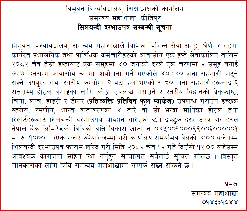 समन्वय महाशाखाको सिलबन्दी दरभाउपत्र सम्बन्धी सूचना