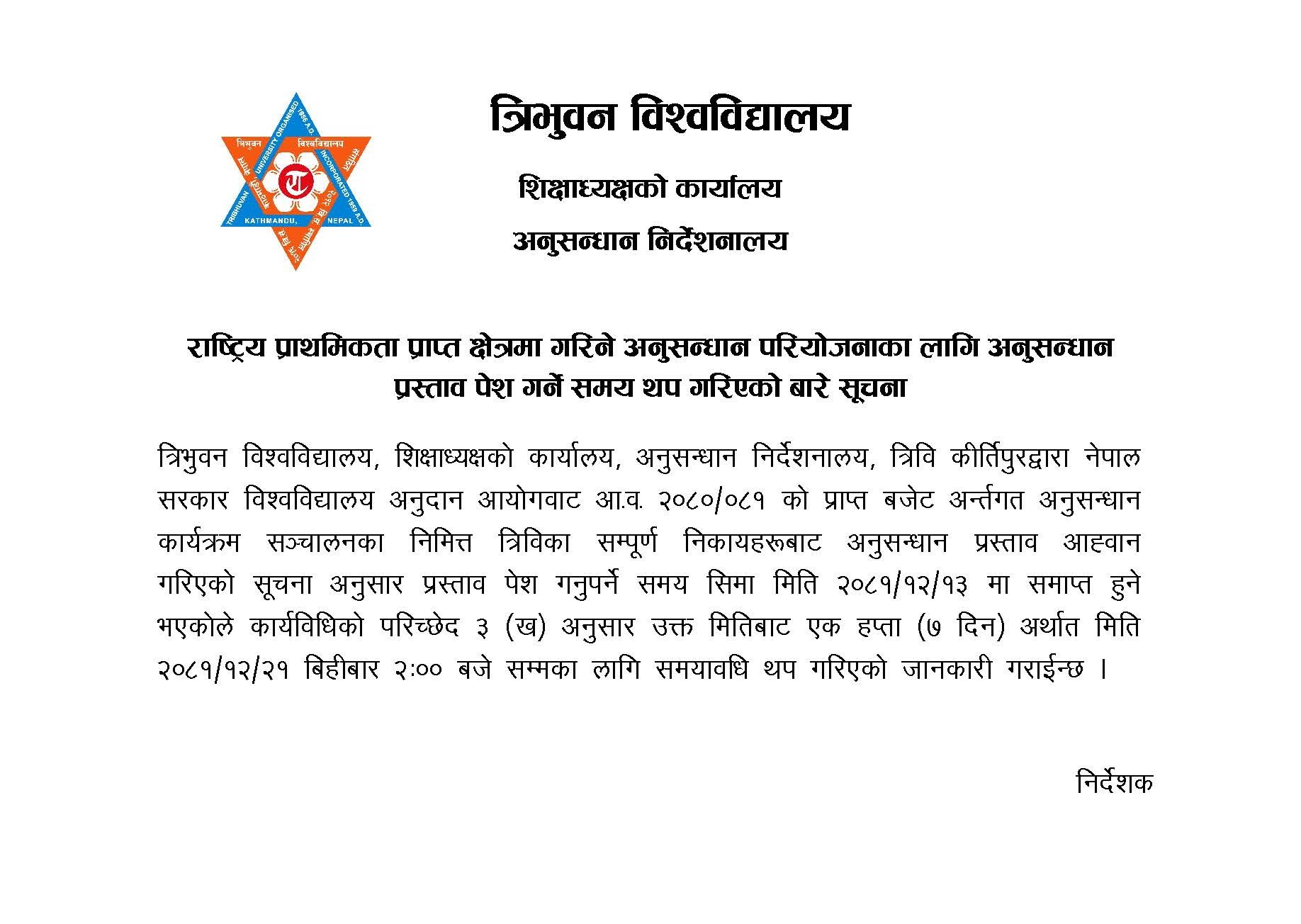 राष्ट्रिय प्राथमिकता प्राप्त क्षेत्रमा गरिने अनुसन्धान परियोजनाका लागि अनुसन्धान प्रस्ताव पेश गर्ने समय थप गरिएको बारे सूचना