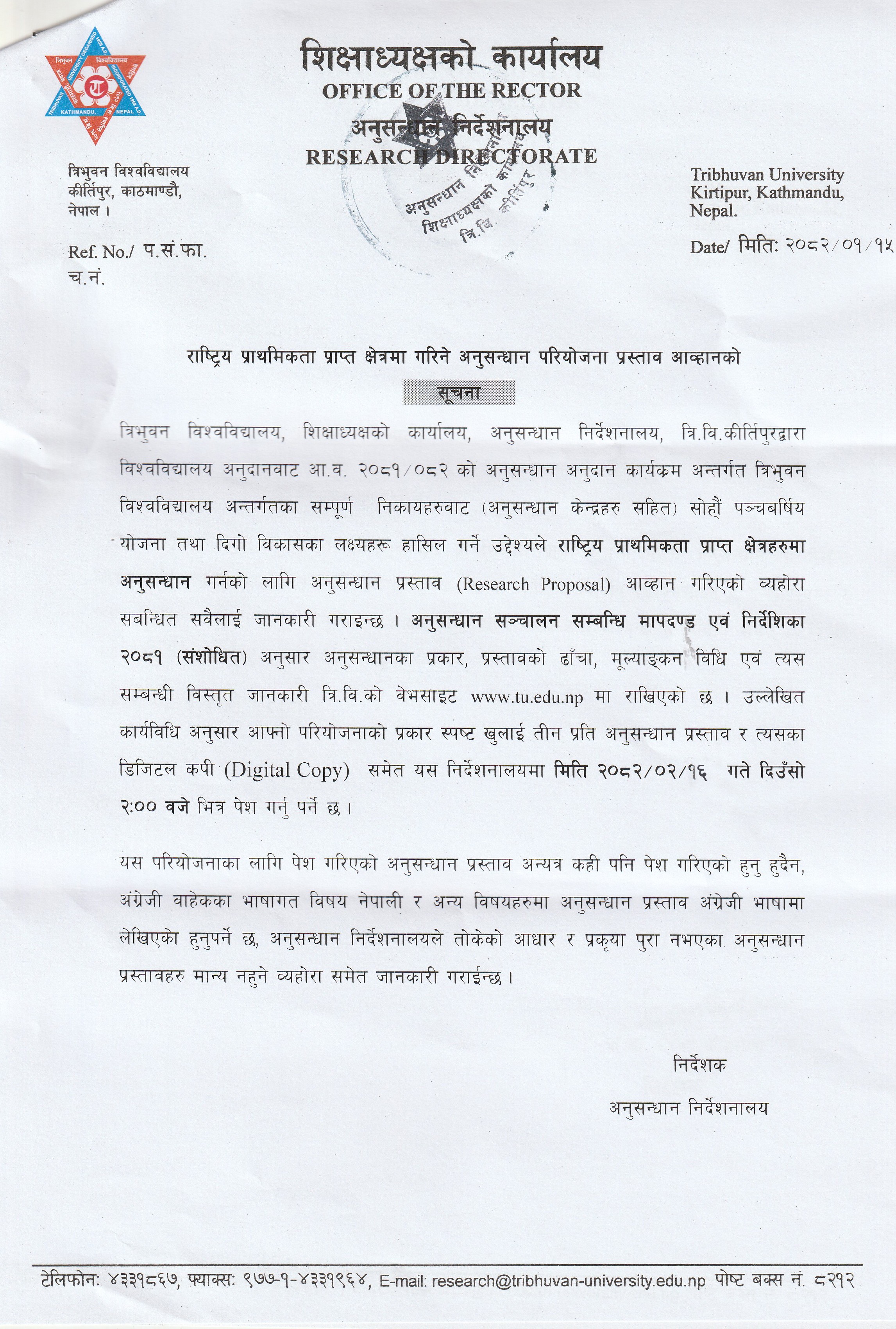 राष्ट्रिय प्राथमिकता प्राप्त क्षेत्रमा गरिने अनुसन्धान परियोजना प्रस्ताव आब्हानको सूचना