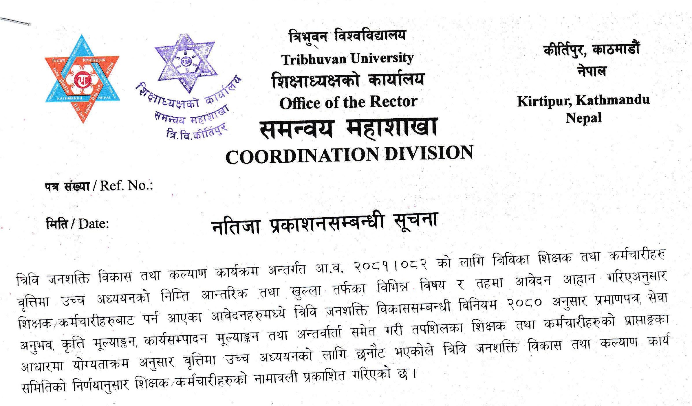 त्रिवि शिक्षाध्यक्षको कार्यालय, समन्वय महाशाखाको नतिजा प्रकाशन सम्बन्धी सूचना