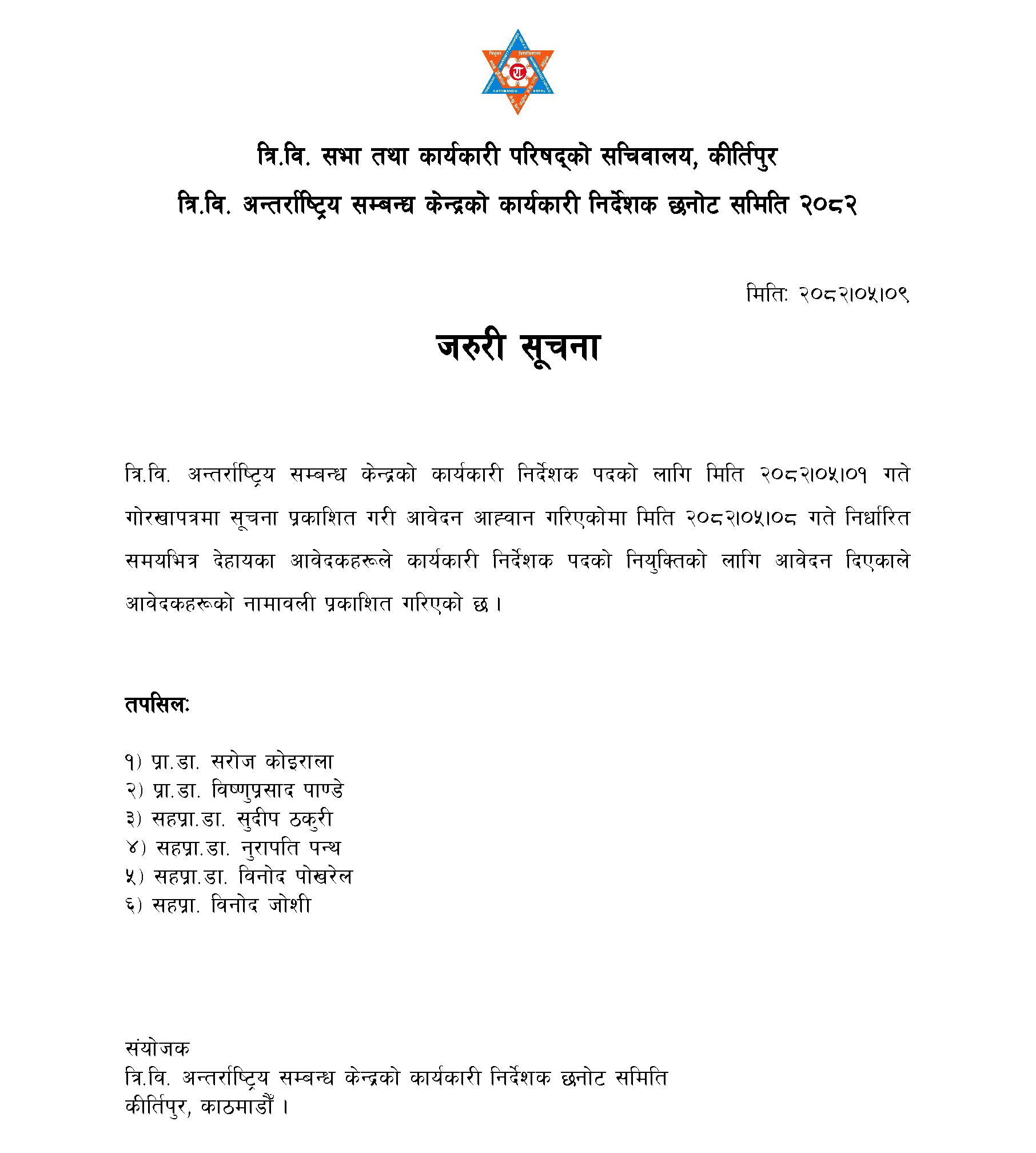 त्रिवि अन्तर्राष्ट्रिय सम्बन्ध केन्द्रको कार्याकारी निर्देशक छनोट समिति २०८२ को जरुरी सूचना