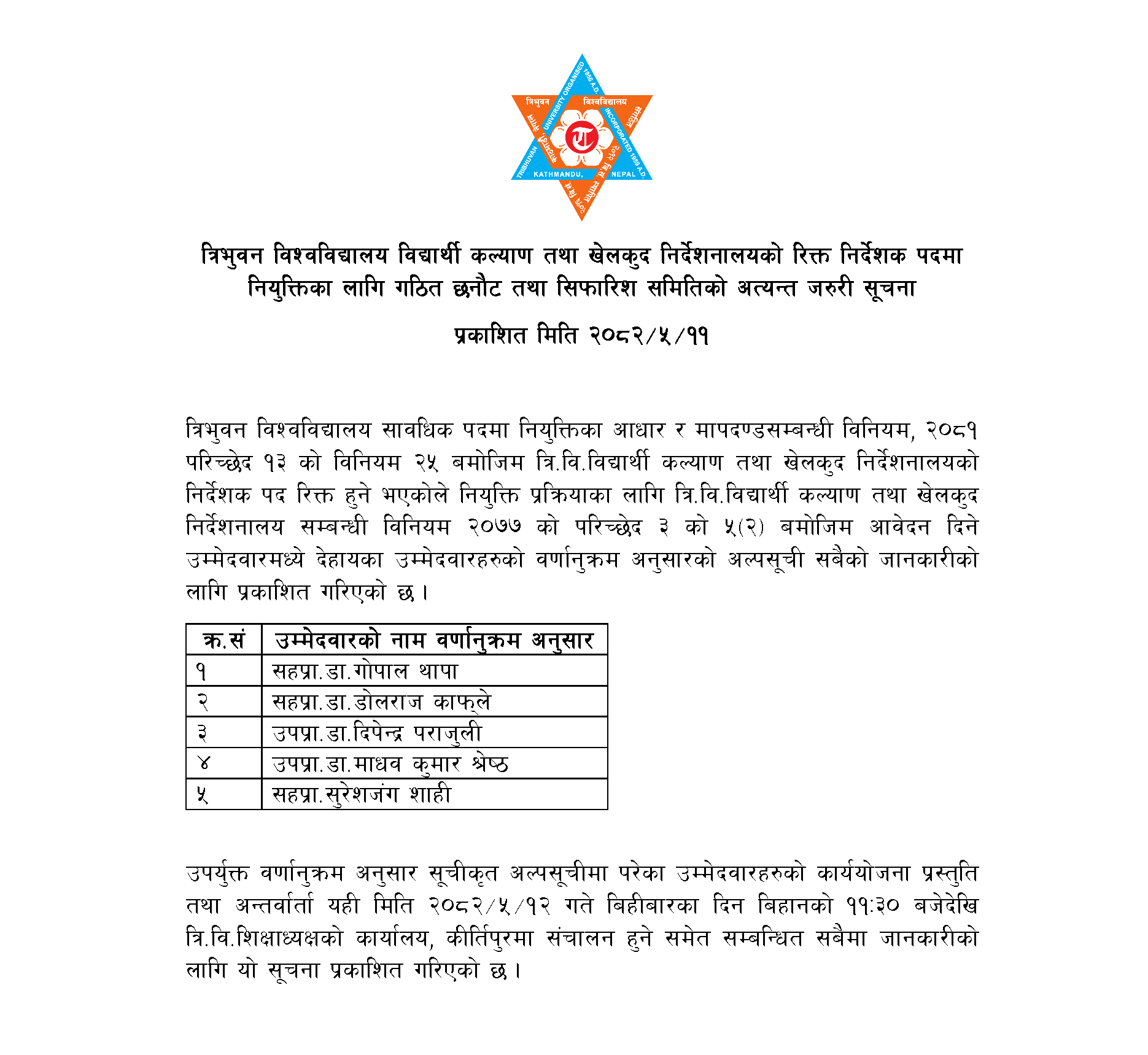 त्रिभुवन विश्वविद्यालय विद्यार्थी कल्याण तथा खेलकुद निर्देशनालयको रिक्त निर्देशक पदमा नियुक्तिका लागि गठित छनौट तथा सिफारिश समितिको अत्यन्त जरुरी सूचना