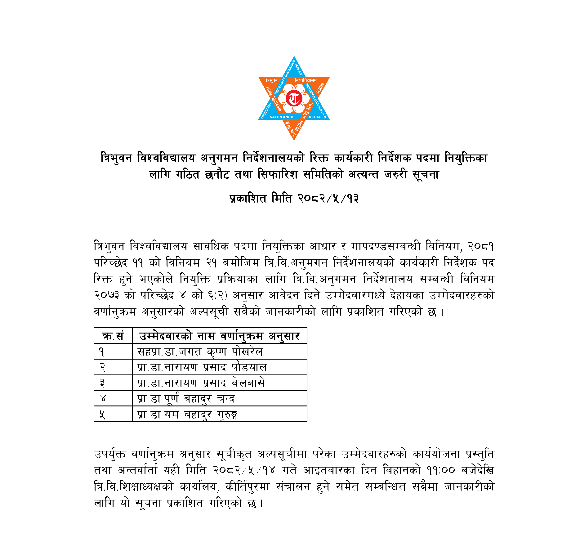त्रिभुवन विश्वविद्यालय अनुगमन निर्देशनालयको रिक्त कार्यकारी निर्देशक पदमा नियुक्तिका लागि गठित छनौट तथा सिफारिश समितिको अत्यन्त जरुरी सूचना