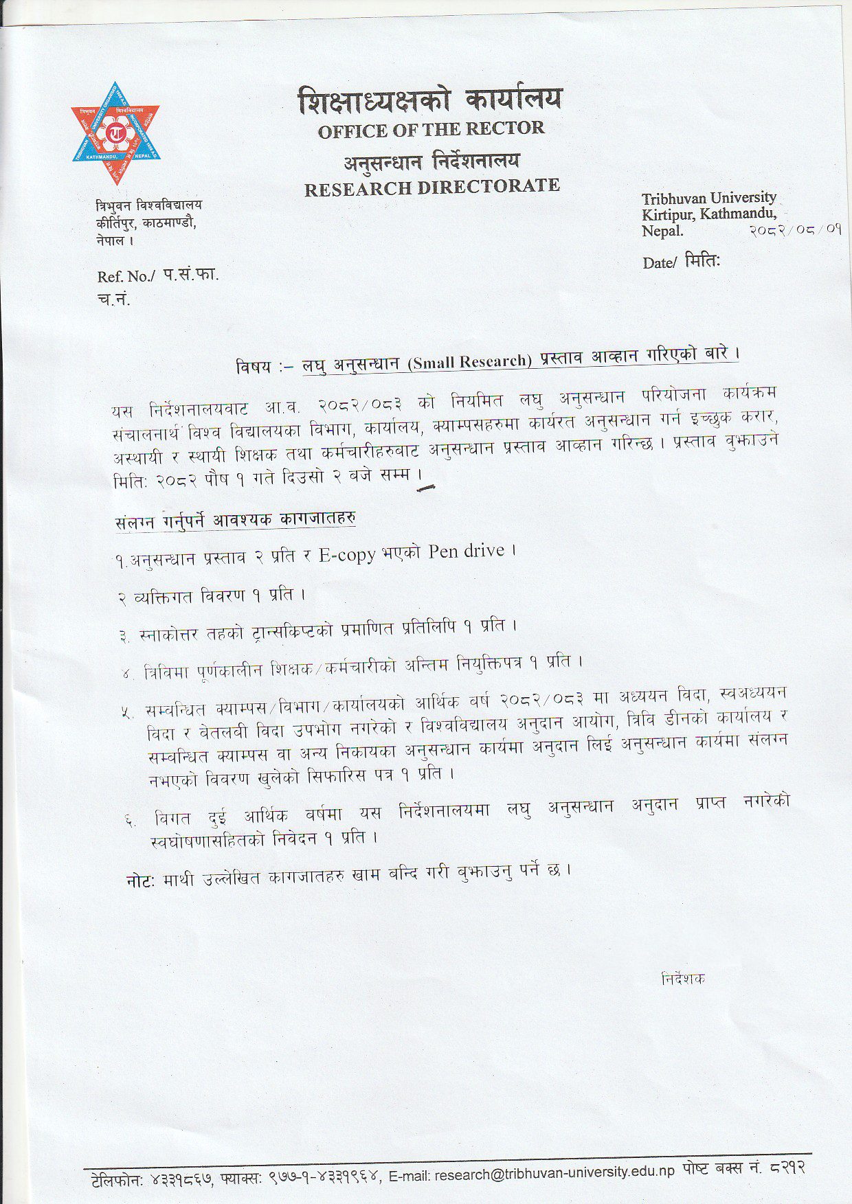 लघु अनुसन्धान (Small Research) प्रस्ताव आव्हान गरिएको सूचना